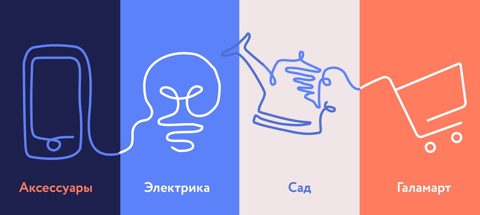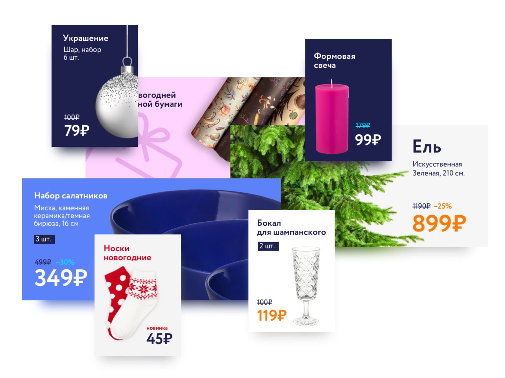 Каждая карточка содержит изображение товара, цену, скидку и имеет свой фон. Некоторые ценники выделены размером, а обозначения товаров имеют простое и понятное название